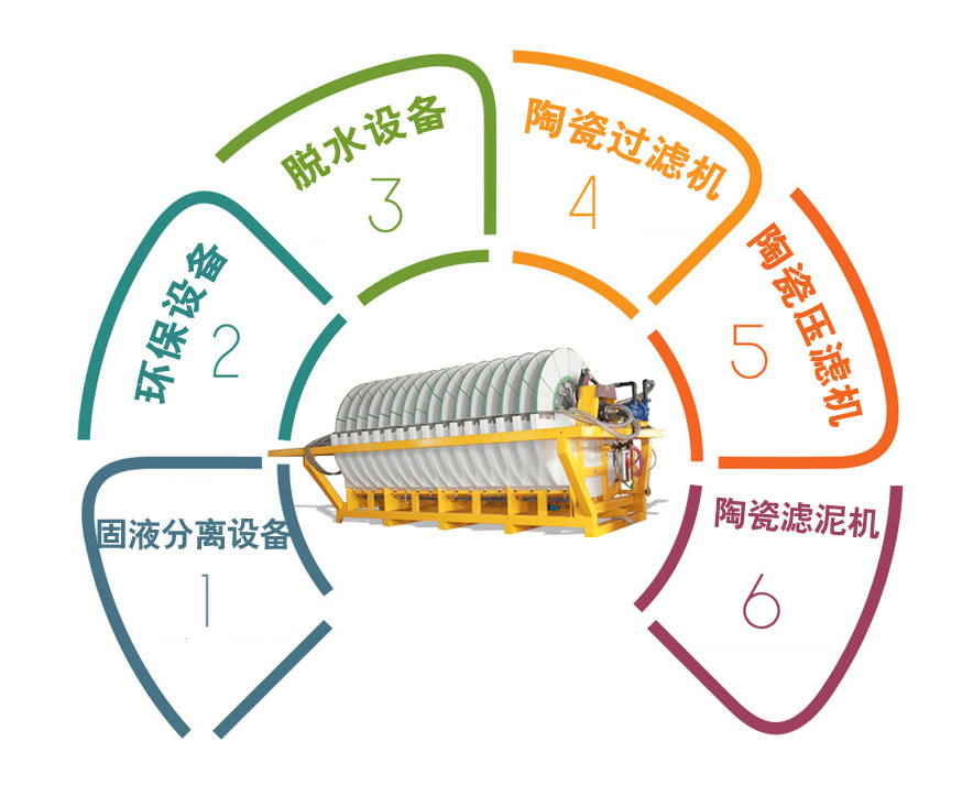 陶瓷過濾機、盤式過濾機目前已廣泛應用于銅、鐵、金、銀、錫、鋁、鉛、鋅、鎳、鈷、鈀、鉬、鉻、銘、 硫、磷、煤、硅、石英、云母、錫土等精礦、尾礦脫水、化工行業氧化鋅、氧化鉛、硫化鋅、電解渣、浸出渣、爐渣 的脫水及環保污水泥脫水廢酸處理等。物料細度從-100目到-450目以及各種超細物料。